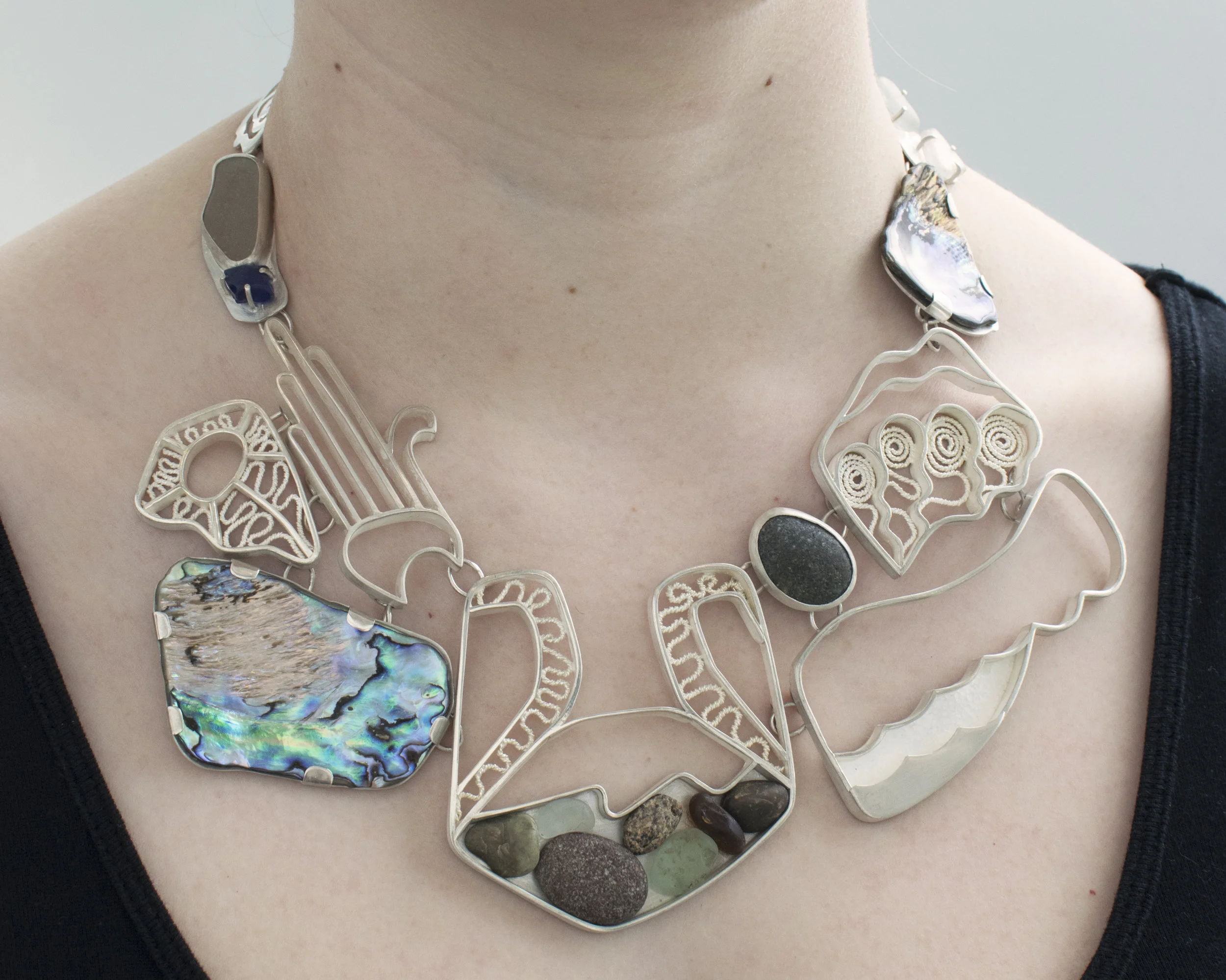 Sterling silver, fine silver, abalone, sea glass, and pebbles, 2018